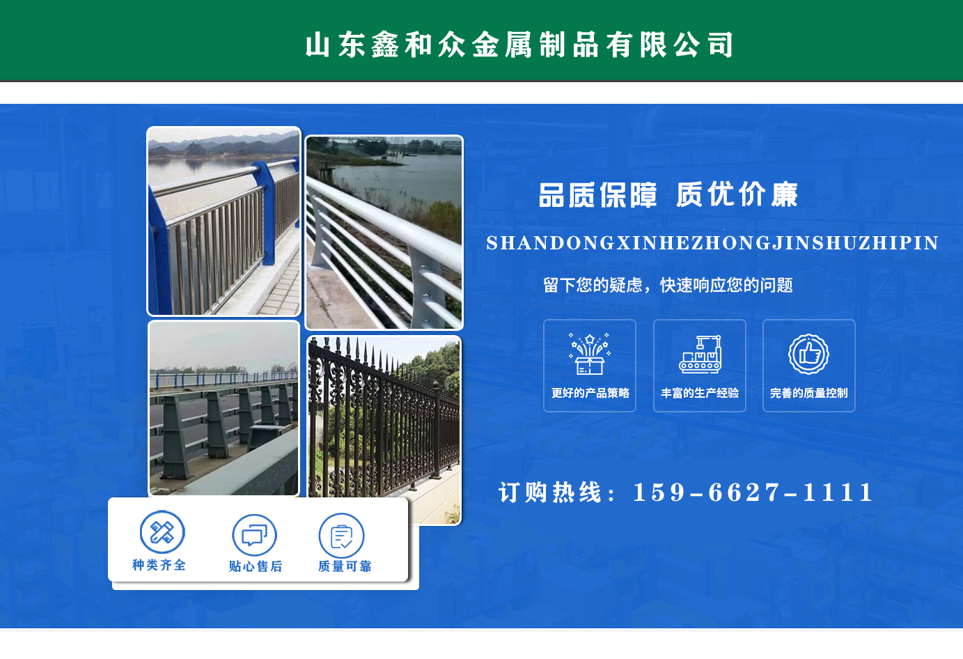 山東鑫和眾金屬制品有限公司主要產品有防撞護欄,橋梁護欄,道路護欄,河道護欄,不銹鋼護欄等護欄。提供設計方案,一站式定制,包您滿意價格優(yōu)惠,歡迎來電咨詢! 公司常年從事銷售護欄防撞護欄,橋梁護欄,道路護欄,河道護欄,不銹鋼護欄,橋梁鋼護欄,河道燈光護欄等。產品廣泛應用于橋梁、河道、旅游景區(qū)、道路、公路、公園、小區(qū)、景觀、道路防撞等領域?! 」井a品均采用優(yōu)質不銹鋼材料,符合相關標準。各種型號不銹鋼復合管及護欄,質量嚴格把控。產品強度高、耐腐蝕、焊接牢固、抗沖擊、性能好,防撞護欄結構簡單、美觀實用大方。 歡迎前來訂購!...